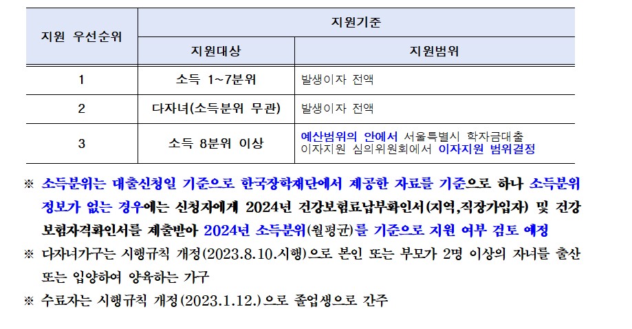 | 지원 기간 | 2024년도 7~12월 발생 이자(등록금,생활비포함) |